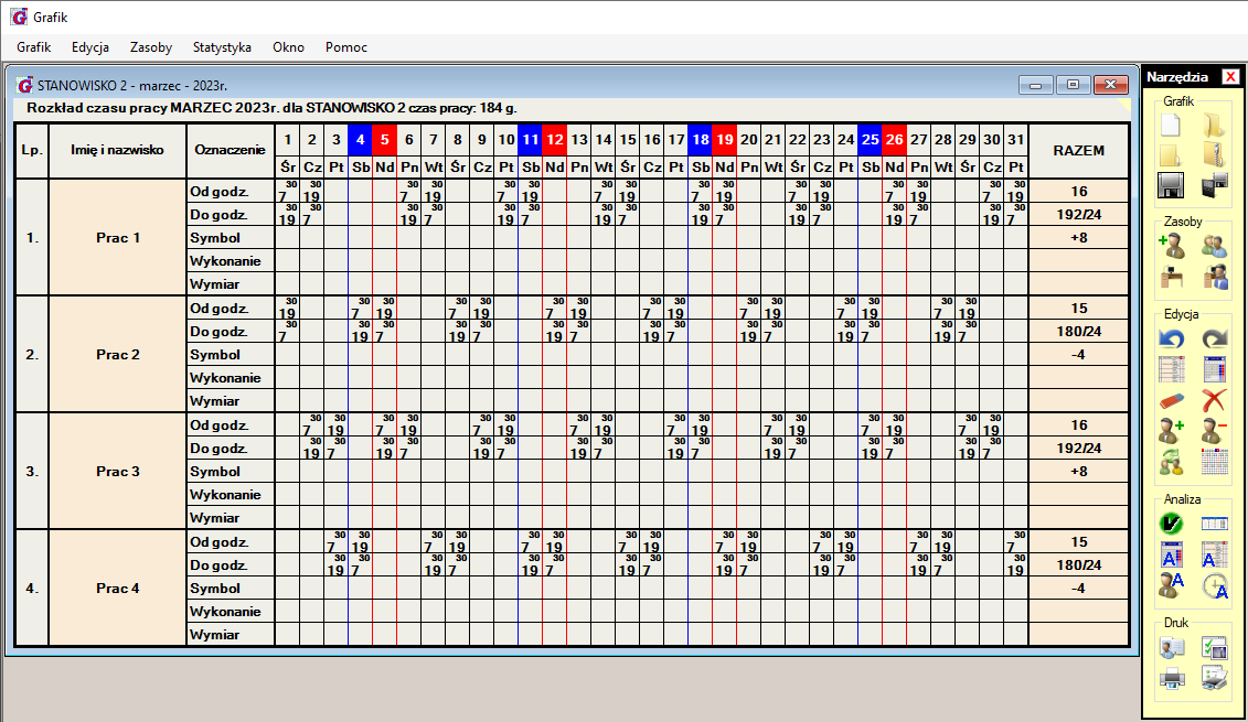 Po wykonaniu planu pracy grafik można wydrukować celem udostępnienia go na docelowym stanowisku. Program umożliwia eksport wykonanych grafików i analiz w formacie pdf oraz przesłanie wykonanego harmonogramu emailem na konkretne stanowisko pracy.