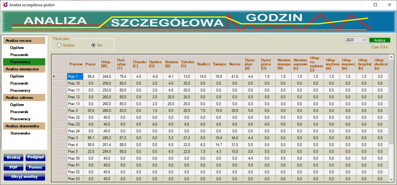 Przedstawia zbiorczą analizę godzin wszystkich pracowników w danym roku z rozbiciem na kategorie: Praca wykonana, Urlop, Dodatkowy urlop, Chorobowe, Opieka, Badania, Szkolenia, Nadliczbowe, Świąteczne itp. Godziny nadliczbowe liczone są na podstawie wymiaru czasu pracy pracownika dla każdego miesiąca oddzielnie, jak przy miesięcznym okresie rozliczeniowym. Można wybrać dowolny rok i po naciśnięciu przycisku Analizuj dane zostaną zaktualizowane. Domyślnie analiza jest wyświetlana w godzinach. Istnieje możliwość zmiany godzin na dni (1 dzień = 8 godz.).