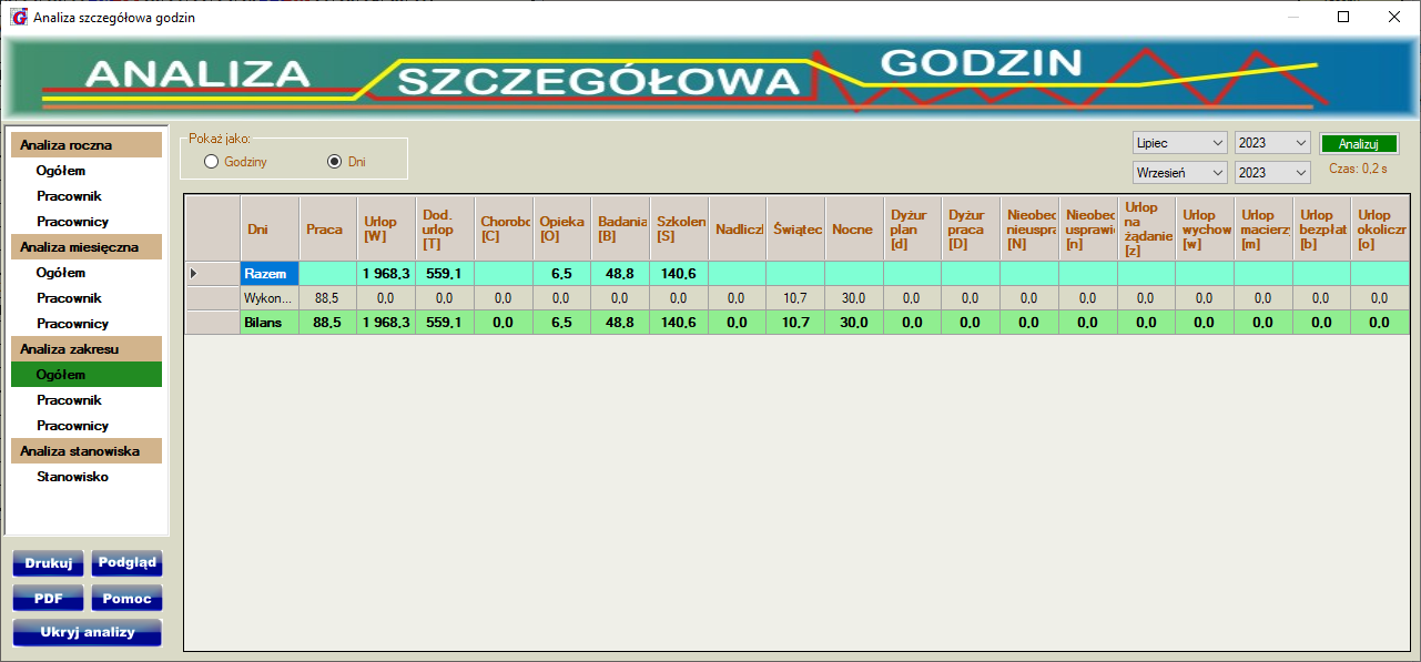 Przedstawia analizę godzin wszystkich pracowników w wybranym zakresie czasu pracy z rozbiciem na kategorie: Praca wykonana, Urlop, Dodatkowy urlop, Chorobowe, Opieka, Badania, Szkolenia, Nadliczbowe, Świąteczne itp. Godziny nadliczbowe liczone są na podstawie wymiaru czasu pracy pracownika dla wybranego okresu rozliczeniowego. Można wybrać dowolny zakres czasu i po naciśnięciu przycisku Analizuj dane zostaną zaktualizowane. Domyślnie analiza jest wyświetlana w godzinach. Istnieje możliwość zmiany godzin na dni (1 dzień = 8 godz.).