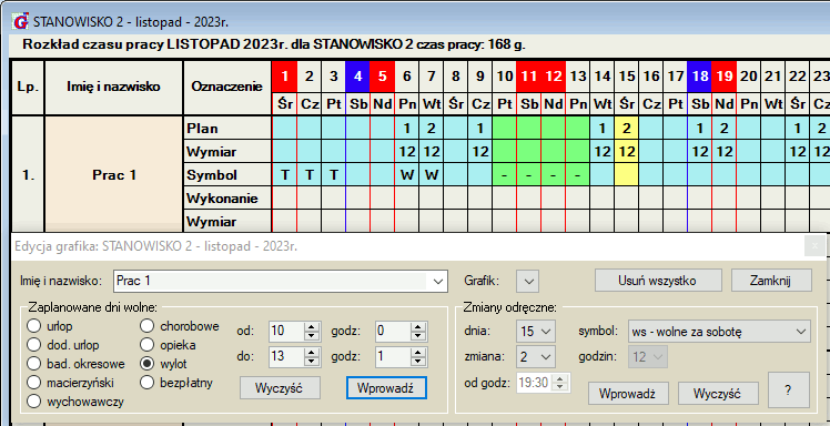 Zaplanowane dni wolne – grupa operacji związanych ze wstępnym planowaniem dni wolnych od pracy. Planowanie rezerwuje pewną ilość dni pod urlop, chorobowe, opiekę itp., ale nie określa zmiany i ilości godzin z tym związanych. Wartości te należy wprowadzić odręcznie. Opcja wylot umożliwia zabezpieczenie dni wolnych z innego, dowolnego powodu. Aktywuje ona pola godzin, gdzie można określić zakres czasu wolnego z dokładnością godzinową. Każdą wprowadzoną zmianę należy zatwierdzić przyciskiem Wprowadź. Przycisk Wyczyść działa odwrotnie, usuwa planowane dni wolne w określonym przedziale czasowym.