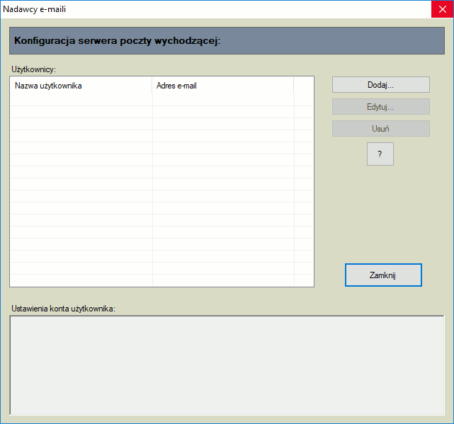 Konfiguracja serwera poczty wychodzącej umożliwia dodanie, edycję danych i usuwanie nadawców wiadomości: