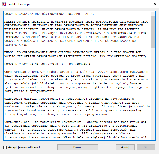 Polecenie menu Pomoc->Rejestracja otwiera okno Grafik – Licencja zawierające treść licencji konieczną do zaakceptowania podczas rejestracji licencji na użytkowanie programu.