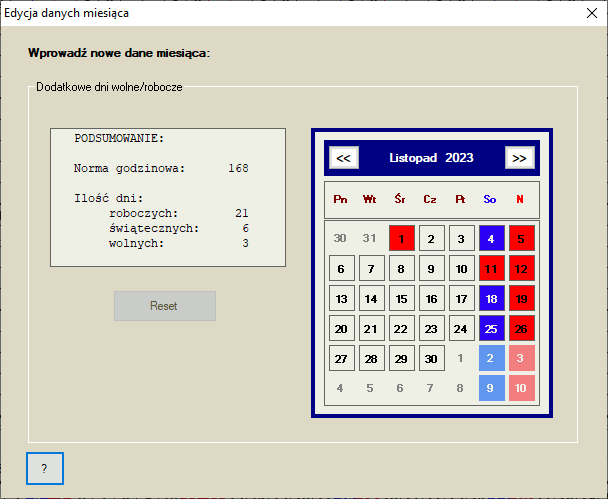 Aktywność przycisku Reset uwidacznia, czy w danym miesiącu wprowadzono zmiany związane z typem dnia. Chcąc zmienić typ dnia klikamy przyciskiem myszki na dowolny dzień miesiąca. Zostanie otwarte okno umożliwiające wprowadzenie odpowiednich zmian. Wszystkie wprowadzone zmiany w typach dni widocznego miesiąca, można usunąć przyciskiem Reset.